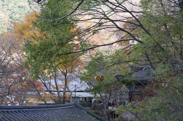 내려가는 하산 길엔 군데군데 암릉도 보이고 통천문(通天門)이 아닌 송천문(松天門)을 지나 전망대에서 바라보는 서해안 아름다음에 경탄을 금치 못한다. 느티나무가 빽빽이 가지를 늘어트린 축대아래서면, 정암사는 흡사 머리위에 산새둥지처럼 올라앉았다. 범종각 다락을 지나 그 뒤에 심검당, 뜨락 위에 극락전, 그 앞으로 요사채, 내려다보면 광천바닥이 발치아래 보인다. 지금 현판에는 '淨巖寺'로 쓰였지만 동국여지승람에는 '正庵寺'로 되어 있다. 본디 백제 성왕3년(527)에 지어진 절로서 신라 헌강왕 때 이웃하는 성주산에 성주사를 크게 일구고 거기 '낭혜화상백월보광지탑비(국보8호)'에 자취를 전하는 그 무염대사가 크게 중수했다지만, 고려고종 25년(1238) 몽고침략 때 불타고 그때 흔적은 남아 있지 않다. 그러다가 임진왜란 때 서산대사가 승병을 이끌고 주둔 했다는 것이 자랑이지만, 지금의 절 건물은 20여년 전에 새로 지어진 것이라 한다. 상담 주차장으로 내려오는 마을길엔 빨간 감이며, 무우, 배추, 당근 등 싱그러운 채소들이 먹음직스럽게 나를 반긴다. 주차장에 내려오니 500 여명의 동문들이 한데 어울려 축제의 장을 이룬 가운데 화합과 친목을 다지고 있었다.