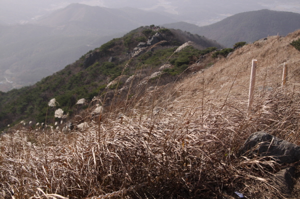 오서산 정상은 그때 기억을 더듬는 듯, 구름 속에 덮여 있는 주류성을 내려다보고 있지만, 얼방산에 있는 흰 구름은 부흥군의 아픈 역사를 아는지 모르는지 한가롭다. 후배들이 준비해온 홍어회 안주와 막걸리 한잔에 목을 축이고 약 2km에 걸쳐 길마처럼, 혹은 황소 잔등처럼 나우리치는 그 긴 둔덕에는 나무 한그루 없이 그대로 억새로만 뒤 덮혀 있지만, 때늦은 늦가을이라 출렁거리는 억새는 보이지 않고 앙상한 억새에 바람만 스친다. 능선을 따라 공사 중인 오서정을 지나 홍성군에서 세운 오서산 정상석을 만난다. 이렇게 오서산은 보령시와 홍성군 양대 시군에서 세운 정상석이 각각 한 개씩 두 개가 세워져 있다. 같은 산인데 지자제 경계가 다르다고 거대한 정상석을 두개씩이나 세워야 하는지, 이것이 우리나라 지자체의 병폐이고 단점이 아닐런지...