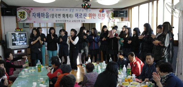 광천여자중학교(교장 이선우)는 지난 12일, 1교1촌 결연 마을인 장곡면 화계리 노인회관을 찾아 어르신들을 위한 경로잔치를 베풀었다.