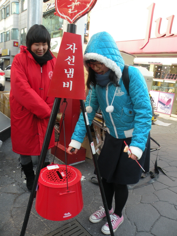 구세군 자선냄비 사랑의 종소리가 명동거리에 울려 퍼졌다. 구세군 홍성교회는 지난 11일부터 자선냄비 모금 활동을 시작해 오는 24일 자정까지 어려운 이웃을 돕기 위한 본격적인 모금활동을 한다. 구세군 자선냄비가 한국에서 시작된 것은 1928년 12월 15일 당시 한국 구세군 사령관이었던 박준섭(죠셉 바아) 사관이 서울의 도심에 자선냄비를 설치하고 불우이웃돕기를 시작하면 서다. '가난한 이웃을 도웁시다' 라는 말이 메가폰을 통해 거리에 울려 퍼지고 힘껏 흔드는 종소리가 거리를 스치는 사람들의 가슴에 메아리칠 때 이를 위해 순수한 이웃 사랑으로 참여하는 자원 봉사자들과 정성을 베푸는 시민들의 마음이 한데 어우러져 겨울은 그리 춥지 않은 훈훈함을 느끼게 된다. 매서운 한파에도 자신보다 더 어려운 처지에 놓인 사람들에게 사랑과 희망을 실천하려는 시민들의 손길이 이어지며 온정이 구세군 자선냄비에 쌓여가고 있다.부모와 함께한 어린이부터 친구, 연인, 동료 등 앞 다퉈 희망을 담아 더불어 사는 세상을 꿈꾸는 사랑의 종소리는 더 크게 울려 퍼져 나갔다. 자선냄비를 통해 모금된 성금은 영세민 구호, 사회사업시설에 대한 원조, 각종 이재민 구호, 신체 장애자 구호 등에 쓰인다. 사진은 어린 여학생이 용돈을 아껴 구세군 자선냄비에 기쁜 마음으로 성금하고 있다.
