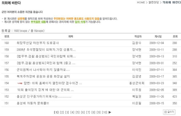 주민 김 모(남장리)씨는 "현재 군의회 홈페이지를 접속하면 단순한 안내글 게재에 그쳐 의원들의 의정활동과 군정현안에 대한 사안에 대해 어떤 내용을 논의했는지 전혀 알 수 없다"며 "홈페이지 공지사항에 의회 중요 일정과 의정활동에 대한 부분을 상세하게 고시하지 않는 이유는 그야말로 비밀의회요, 닫힌 의회요, 군민들의 의견은 필요 없다는 것 아니냐"며 분통을 터뜨렸다.