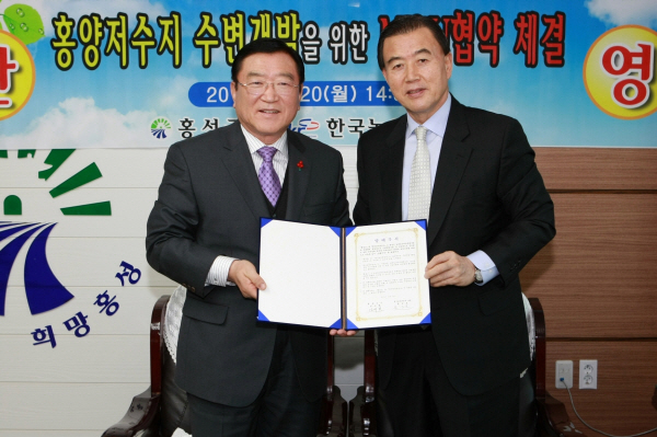홍성군에 모처럼 희망의 빛이 보인다. 2012년 충남도청 홍성이전을 앞두고 새 청사가 상량식을 갖고 모습을 드러낸 가운데, 홍성군은 민선 5기 첫 대형 사업으로 '홍양저수지 수변개발사업'이란 성과를 이뤘기 때문이다. 홍성군(군수 김석환)은 지난 20일 한국농어촌공사(사장 홍문표)와 홍성군수실에서 홍양저수지 수변개발사업의 성공적 추진을 위한 양해각서(MOU)를 체결했다. 홍양저수지 수변개발 사업은 '농업생산기반시설 및 주변지역 활용에 관한 특별법'에 의해 한국농어촌공사와 홍성군이 총 사업비 157억원을 투입, 홍성군 금마면 소재 홍양저수지 일원 41만1983㎡를 수변공원으로 조성하는 사업이다. 사업비 157억원은 한국농어촌공사 자체 예산에서 102억원을 투입하고, 나머지 55억원은 국비를 확보해 충당할 계획이다.