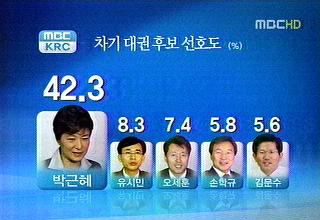 또 <MBC>가 코리아리서치센터에 의뢰, 전국 만 19세 이상 성인남녀 1000명을 상대로 지난달 27일 실시한 전화여론조사 결과(95% 신뢰수준에 오차범위는 ±3.1% 포인트) 박근혜 전 대표는 42.3%를 기록, 유시민 전 장관(8.3%), 오세훈 서울시장(7.4%), 손학규 민주당 대표(5.8%), 김문수 경기도지사(5.6%)를 압도했다. 계속해서 <문화일보>가 디오피니언에 의뢰, 전국의 성인남녀 1000명을 대상으로 지난 달 28일, 29일 진행한 전화조사 결과(95% 신뢰수준에 ±3.1%포인트) 박근혜 전 대표는 35.3%를 얻은 가운데, 오세훈 서울시장(5.5%), 유시민 전 장관(5.4%), 손학규 민주당 대표(4.5%), 정몽준 전 한나라당 대표(4.3%), 김문수 경기도지사(3.8%), 이회창 자유선진당 대표(3.8%) 등의 순으로 나타났다.