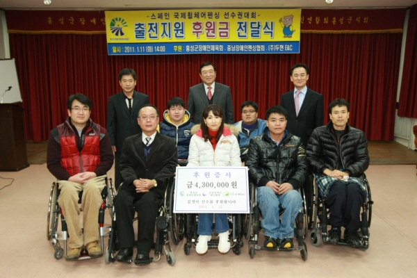 김 선수의 안타까운 사연이 전해지자 홍성읍 남장리 소재 (주)두현 E&C(대표 김규열)가 흔쾌히 300만원을 지원했으며 홍성군 장애인체육회와 충남 장애인 펜싱협회(회장 김호현)가 각각 100만원과 30만원을 후원해 총 430만원이 후원금이 모아져 김 선수는 세계 장애인 펜싱선수권 대회에 출천할 수 있게 됐다.