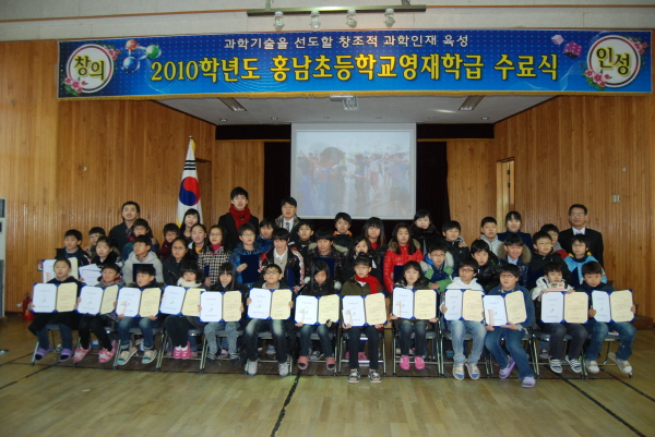 홍남초등학교(교장 권영춘)에서는 지난 7일 2010학년도 제3기 정보영재학급 수료식을 갖고 40명의 학생들에게 수료증을 전달했다. 수료식에 앞서 진행된 R&E 연구결과 발표에서는 학생들이 지난 1년간 학습한 결과를 토대로 연구활동을 총 정리하고 학생들의 연구 성과를 평가하기 위한 자리로 마련됐다.