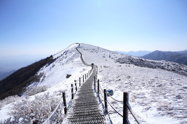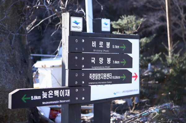 잠시 후에 소백산 천문대가 있는 연화봉(1383m)에 오른다. 소백산 천문대는 1978년 연화봉에 61cm 반사 망원경을 가동하며 한국의 현대적인 광학천문학 연구의 막을 열었다고 한다. 백두대간 종주자들은 죽령부터 포장도로가 이어진 천문대를 지나야 비로소 소백의 품으로 들었음을 느끼게 된다. 첩첩의 산줄기와 장쾌한 능선미를 즐기며 서서히 고도를 높인다. 제 1연화봉(1394.4m)을 지나 비로봉 가는 길은 나무계단이다. 보드랍고 연한 산의 피부가 인간의 간섭에 상처를 심하게 입어서 내린 처방이다. 그러나 여기서 부터 추위와 칼바람에 사투는 시작된다. 바람을 막아줄 나무 한그루 없는 허허 벌판에 초속 30m의 강풍 앞에 몸이 술 취한 사람처럼 갈지자걸음이다. 몇 번이고 넘어지려는 것을 난간에 겨우 의지해 반보씩 오르는 계단은 다리가 천근만근이다. 손가락이 아플 정도로 시려온다. 새로 준비한 방한장갑의 효력이 여기가 한계이다. '살아 천년 죽어 천년'이라는 주목군락지가 있는 곳이지만 추위와 바람, 어둠에 사방이 꽁꽁 얼어붙어 아무것도 보이지 않는다. 아니 아무 생각도 나지 않는다. 어떻게 올라 왔는지, 얼마나 걸렸는지도 모른 채 정상인 비로봉(1439.5m)에 오른다.