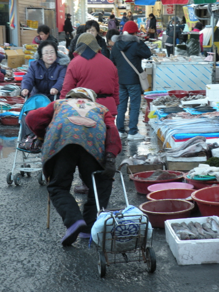 노환으로 등이 휘어 지팡이에 의지해 수레를 끌고 장 보러 나온 고령의 할머니는 "그래도 명절인데 아들 손주들 줄려고 옷도 사고 생선도 사려고 나왔지"라며 바쁜 발걸음을 재촉한다.