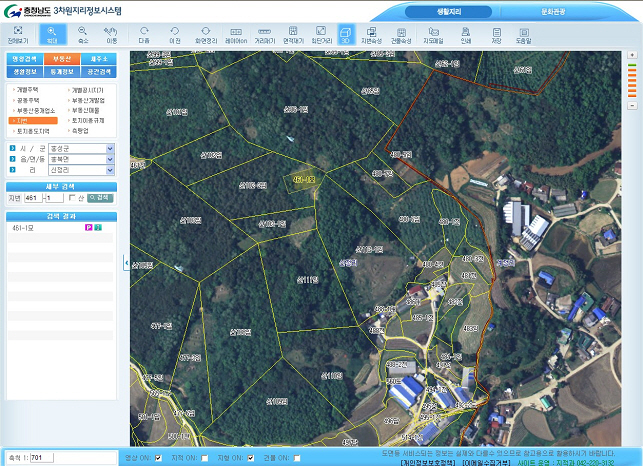 2차원 지리정보 화면은 지적도와 지번, 항공사진 영상을 볼 수 있어 항공사진지도, 현장묘지사진, 족보와 토지정보(민원24시서비스http://www.minwon.go.kr)에 의한 산소(墓地)대장을 만들 수 있으며, 상단의 3D 기능을 클릭하면 해당 지역을 비행기를 타고 내려다보는 비행시믈레이션으로 볼 수도 있다.