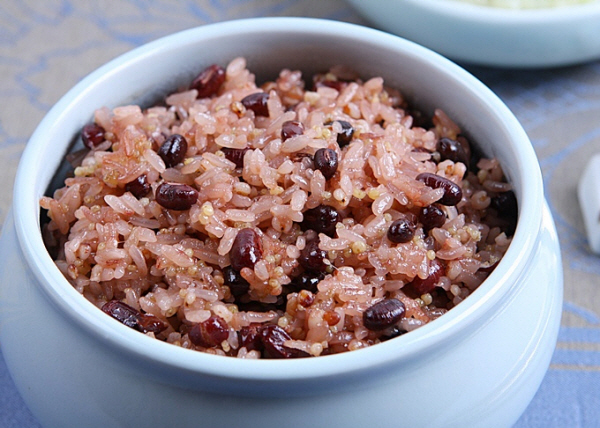 찹쌀 ▷2컵, 멥쌀 ▷1컵, 팥 ▷1/4컵, 밤 콩 ▷1/4컵, 조 ▷1/4컵, 수수 ▷1/2컵, 밤 ▷10개, 대추 ▷10개, 소금 ▷1작은술, 밥물 ▷2 3/4컵