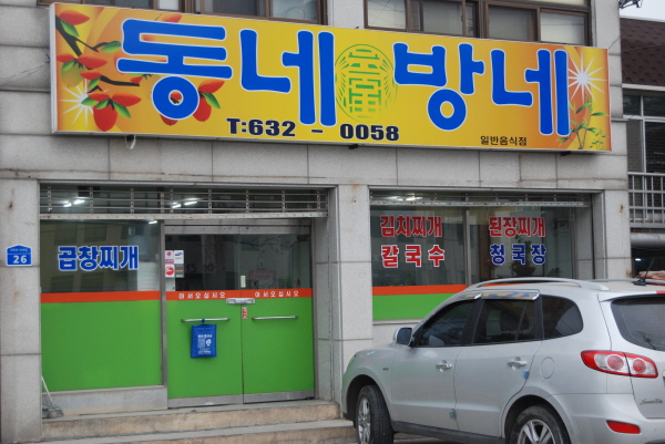 △동네방네 = 가게문을 연지 1년 안된 가게지만 맛으로 '입소문'이나 손님들의 발길이 끊이지 않는다. 멸치로 우려낸 육수에 양념장이 별도로 첨가된 칼국수는 얼큰하고 시원한 맛을 자랑한다. 또 다른 주 메뉴인 압력솥에 삶아 나오는 '곱창찜'의 맛은 쌍벽을 이룬다. 김이 모락모락 나는 곱창찜의 고소함과 부드러움은 색다른 맛을 느끼며 유기농쌀로 만든 내포막걸리와 훌륭한 조화를 이룬다. 칼국수 5000원. 곱창찜 中 1만원(2인분), 大 2만원(3~4인분). 홍주병원 맞은편. 632-0058.