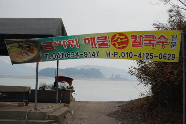 △금바위 손 칼국수 = 서부면 남당리에 위치한 해물 손 칼국수 집이다. 주 재료인 바지락과 미더덕으로 푸짐하고 양많은 해물칼국수는 풍부하고 시원한 바다 내음을 전해준다. 특히 칼국수 면을 주인부부가 직접 반죽하고 만들어 진정한 '수타면'을 고집한다. 또한 직접 재배한 배추를 바닷물에 절여 담근 절임김치와 함께 듬직듬직한 해물파전과 결성막걸리는 금상첨화를 이뤄 해물 손 칼국수 못지 않은 맛과 인기를 자랑한다. 해물손칼국수 5000원, 해물파전 8000원. 서부면 남당리. 634-9147.