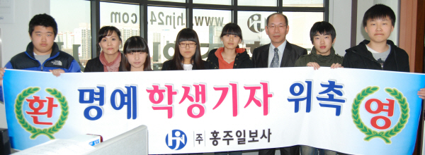 홍주신문(대표 한관우)은 지난 26일 본지 제1기 학생기자단 위촉식을 가졌다. 이날 위촉식에는 ◇풀무고등학교 김민경, ◇홍성고등학교 박찬, 황순재, 강재석, ◇홍성여자고등학교 김윤하, △홍주고등학교 황지수 학생 등 총 6명의 학생명예기자에게 임명장을 수여했다. 본지 제1기 학생명예기자들은 홍성군내 고등학생으로 구성되어 학교내외의 이야기, 학교현장의 미담사례와 개선사항 등을 취재해 기사화 하고, 친구 및 선생님 소개 등 알콩달콩한 글과 청소년들의 시선으로 바라본 홍성군의 지역현안에 대한 생각 등이 본지 지면에 소개될 예정이다. 본지 최선경 편집국장은 "성인이 아닌, 학생신분이라는 특별한 눈높이에서 바라본 우리 교육현장의 모습이 어떻게 참신하게 담겨질지 참 궁금하고 기대된다"며 "학생명예기자들이 적극적이고 진실한 보도활동을 통해 교육현장의 벽에 갇힌 아름다운 진실을 구해내는 견인차 역할을 해내리라 기대한다"고 소감을 밝혔다.