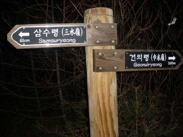 지난번 인원이 줄어서 한 대로 출발했던 버스가, 이번에는 다행히 두 대에 나눠 타고 들머리인 피재에 새벽 03시경 도착한다. 피재는 삼파수, 곧 삼수령(三水嶺)이다. 고갯마루 정점에 떨어진 빗물이 남으로 흐르면 영남의 젖줄인 낙동강으로 흘러 남해로, 북으로 흐르면 한 반도 중부 내륙의 젓줄인 남한강으로 흘러 서해로, 동으로 흐르면 오십천으로 흘러 동해에 몸을 섞게 된다. 순간의 선택이 평생의 운명을 결정짓게 되는 것이다. 그것을 증명이나 하듯 세 개의 물방울을 연상시키는 상징탑이 세워져있고 그 옆에는 아름다운 정자가 쉬어가라며 객을 맞이하는데 대간길은 정자 옆으로 열린다. 한편 삼척 사람들이 난리를 피해 넘어오는 고개라 하여 피재라고 하였다고 한다. 03시20분 피재를 출발하여 10여분 숲길을 걸으니 임도가 나오고 조금 지나 길은 다시 산길로 이어진다. 우측으로 낙엽송이 울창한 숲길을, 앞만 보고 걷다보면 건의령(巾衣嶺.한의령)에 도착한다.(05시20분)