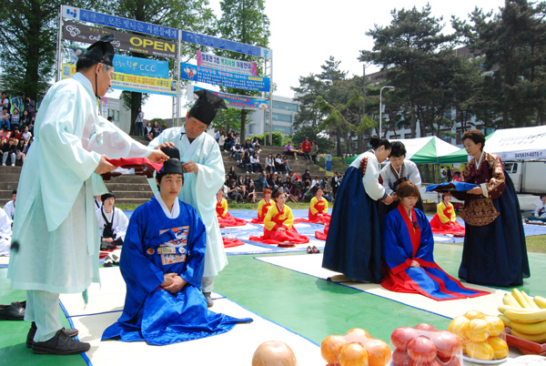 지난 16일, 성년의 날을 맞아 대학 캠퍼스에서는 전통의식에 따라 성년식이 개최됐다. 혜전대학(총장 이재호)에서는 올해 성년이 되는 남`녀학생 22명이 홍성문화원이 주관하는 성년식에 참여해, 어른이 입는 세 가지 복장을 갈아입으며 교훈을 전하는 <삼가례>, 어른이 되었음을 상징하는 의미로 관자(남자)에게는 관을, 계자(여자)에게는 비녀를 틀어주는 <가관례>, 술과 차를 마시는 법도를 알려주는 <초례> 등이 진행됐다.