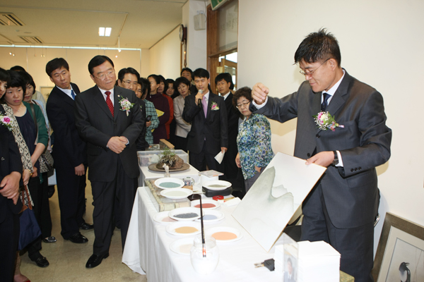 26일 오픈행사에는 김석환 군수, 한국예총홍성지회 오정자 회장, 청운대 이종화 교수, 이용순 홍성도서관장 등의 내빈과 100여명의 관람객이 참여했고, 김석환 군수의 축사와 김기철 화백의 인사말에 이어, 김 화백의 돌가루그림 시연이 펼쳐졌다.