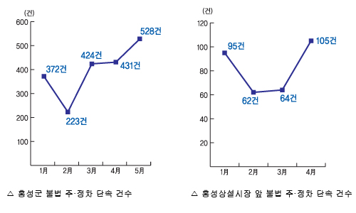 홍성군에 따르면 불법주정차과태료부과 건수는 점차 증가하고 있는 추세이다. 홍성군 전체로 보면 올해 1월에 372건 이었던 단속건수가 5월에는 528건으로 증가했고, 군민들의 제보와 민원이 잇달았으며, 고정식 CCTV가 설치된 홍성상설시장앞 도로의 경우 2월 62건, 3월 64건에 이어 4월에는 105건으로 최고 수치를 기록했다. 조양문~금강원조경 구간, 금강원조경~홍성축협 구간은 1달 평균 15건 내외인 점에 비해 상대적으로 높은 수치이다.