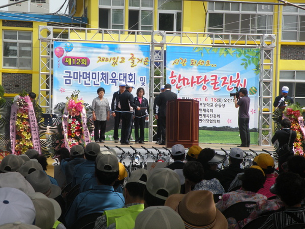 제 12회 금마면(면장 박금자) 체육대회 및 한마당큰잔치가 지난 18일 금마초등학교에서 면민 1000여명이 참석한 가운데 성황리에 개최됐다. 금마면 체육진흥회 이기수 사무국장의 사회로 진행된 개회식에 이어 배양초등학교 사물놀이 공연, 이어서 어르신 공굴리기와 A조와 B조로 나뉘어 다양한 운동경기가 열렸으며 면민노래자랑 및 경품추첨 순으로 진행됐다. 이날 행사에서 권영상 명예면장이 이임하고 조중형 명예면장이 취임했으며 송암리 윤찬헌, 인산리 서수석, 죽림리 김화숙, 죽림리 조영자 씨가 각각 군수표창을 수상했고, 표규택 씨와 이용조 씨가 감사패를, 홍성군청 윤정숙 씨가 공로패를 받았다.