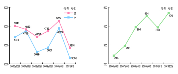 한편 산지 소 값과 매매 값은 바닥을 모르고 곤두박질치고 있는 것과는 반대로 사료 값은 전년 6월(25kg 1포당 9825원)대비 올 6월 현재 19% 인상된 1포당 1만1750원을 기록하고 있다. 이처럼 최근 지속되는 소 값 하락과 사료비 및 생산비의 인상으로 사육농가들이 심각한 경영난에 시달리고 있다.