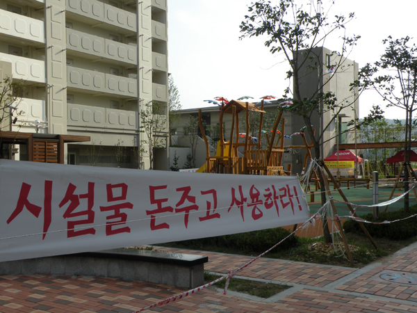 지난달 초부터 입주를 시작한 주공3차 휴먼시아 단지 내 곳곳엔 ‘시설물 돈주고 사용하라’는 붉은 글씨의 현수막이 걸려 있다. 조경 공사를 담당한 원청이 LH공사로부터 공사대금을 받은 후 일부 하청업체에 공사대금을 지불하지 않자 단지 내에 불법현수막을 걸고 어린이 놀이터 등 사용을 못하게 하고 있다는 주장이다.