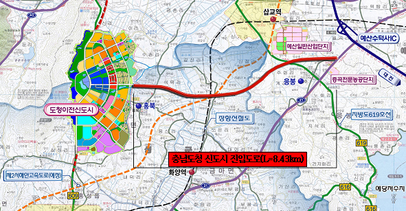 내년 말 충남 홍성·예산 일대에 들어설 충남도청(내포)신도시와 당진-대전 고속도로 예산 수덕사 나들목을 잇는 내포신도시 주 진입도로 건설 공사가 이르면 오는 11일 첫삽을 뜬다.