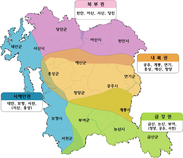 공주와 계룡, 연기, 홍성, 예산, 청양 등 내륙권은 국가·지방 중추행정 연계축으로 지역균형발전 촉진지대로 육성한다는 계획이다.