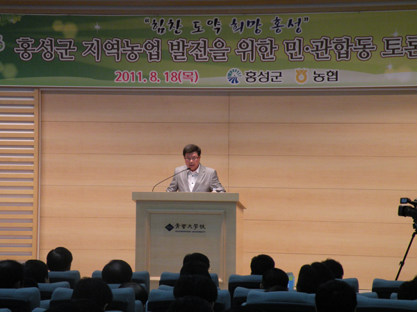 이 자리에서 참석자들은 토론회에 앞서 농협중앙회 원예특작부 안재경 팀장으로부터 ‘농업환경변화와 농산물 유통 전략’이란 주제의 특강을 들었으며, 안 팀장은 케이멜론 사례를 통해 농산물 브랜드 마케팅의 중요성을 설명하고 홍성의 농산물 유통 현황을 분석하여 공선출하회를 통해 전략 품목을 육성하고 홍성군 산지유통센터(APC)를 건립하여 군단위의 강력한 브랜드마케팅 주체를 세울 것을 제안했다.