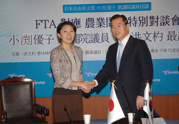한나라당 홍문표 최고위원은 지난달 30일 당사 6층 회의실에서 오부치 유우코 일본 중의원과 간담회를 갖고 양국간 FTA문제를 비롯한 농업교류 방안에 관해 의견을 교환했다. <사진>