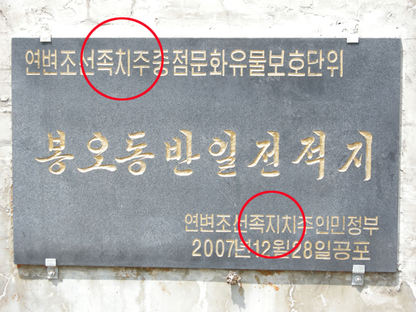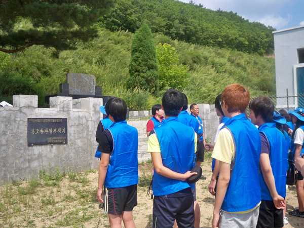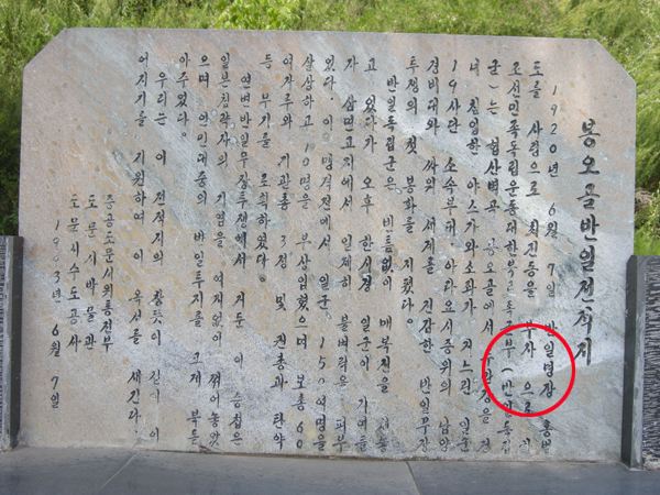 또한 봉오동전투가 있었던 옛 봉오동골짜기는 안타깝게도 지금은 봉오저수지가 그 자리를 지키고 있다. 저 깊은 저수지의 물 아래, 우리의 땅은 아니지만 우리민족의 승리의 기쁨과 함성까지도 이곳 저수지에 묻어버렸다는 생각이 들어서일까. 봉오저수지에서 50여m 내려가면 봉오동반일전적지를 알리는 비석만이 이곳이 독립전쟁의 역사적 현장임을 알려주고 있을 뿐이었다. 비석에는 봉오동 전투의 기록에 대해서 쓰여 있는데, 이런 비석이나 표지판의 문구마저도 훼손하거나 글자나 획을 빼거나 부수는 등 역사왜곡의 실상을 이곳에서도 확인할 수 있어 마음이 아려왔다.