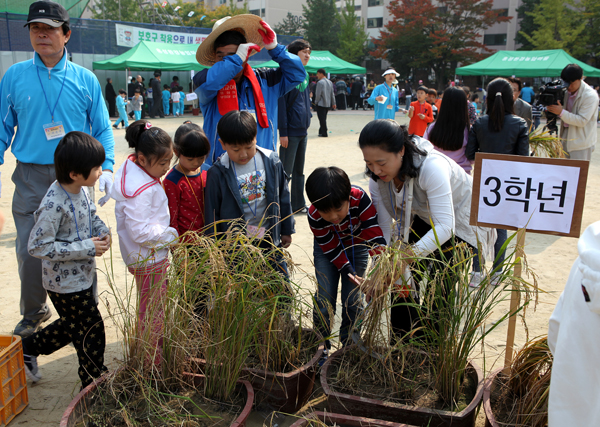 오는 13일 대전 원평초등학교(교장 노봉곤)에서 충남친환경농업인연합회(회장 주형로)의 주관으로 원평초 내 고무통으로 만든 논에 심은 벼를 베고 탈곡하고 추수하는 ‘이색 가을걷이’ 행사가 열린다.