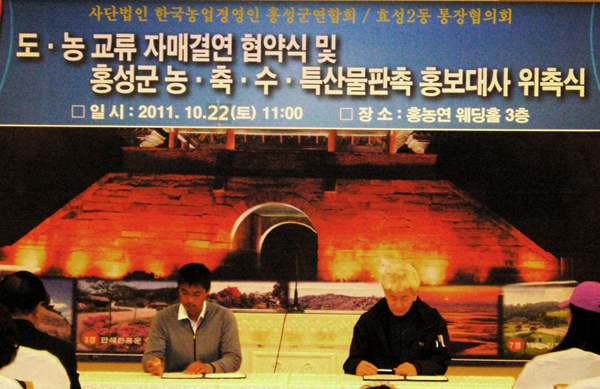 한국농업경영인 홍성군연합회(회장 주정산)와 인천 계양구 효성2동 통장협의회(회장 정철기)는 지난 22일 농산물 직거래장터 운영, 현장학습체험 등 상호 교류의 기회를 마련하기 위한 도농교류 자매결연 협약을 체결했다.