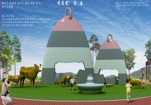 또한 ‘풍요’는 축산군인 홍성의 이미지와 누구나 쉽게 다가가고 편히 쉴 수 있는 친화적인 공간으로서 워낭(소방울)을 형상화화여 소와 돼지의 형상을 투조 및 환조 형식으로 표현하여, 공간을 최대한 살리면서 끊임없이 성장·발전하는 축산홍성의 미래를 상징하여 평가위원들로부터 높은 점수를 받아 당선작으로 선정됐다.