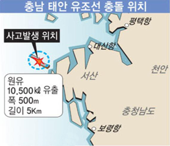 충남 태안 앞바다에서 발생한 원유 유출사고가 발생한지 4일째인 지난 10일 기름띠가 인근 해안으로 확산된데 이어 충남지역 최대의 양식 밀집지대인 가로림만까지 파고들어 사상 최악의 피해가 우려되고 있는 가운데 태안을 비롯한 홍성군 등에 ‘재난사태’가 선포됐다.