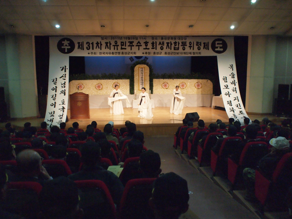 한국자유총연맹 홍성군지부(지부장 유성관) 주최로 개최된 자유 수호 희생자 합동위령제에는 김석환 군수을 비롯한 각 기관 사회단체장, 자유 수호단체 및 유족 등 600여명이 참석한 가운데 홍주한빛무용단의 추모진혼제살풀이, 종교의식, 추도사, 헌사, 헌화·분향 순으로 진행됐다. 이날 거행된 위령제는 광복이후 북한공산집단에 의해 희생된 자유 수호 민간인 희생자 및 호국영령들을 기리기 위해 전국적으로 매년 10월에서 11월중에 거행되고 있으며 올해 31차를 맞이하고 있다.