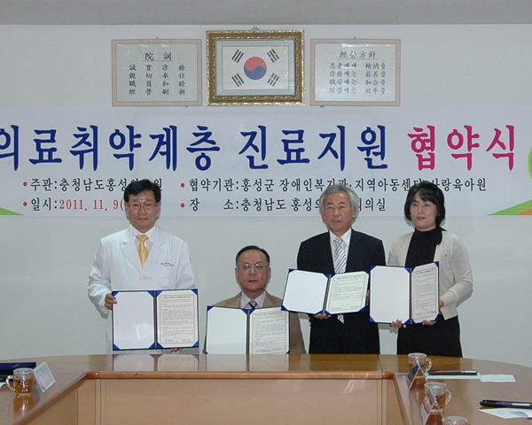 홍성의료원은(원장 김진호) 지난 9일 오전 11시 홍성의료원 2층 소회의실에서 홍성군 장애인종합복지관(관장 김호현), 홍성군 지역아동센터 연합회(회장 강난예), 광천 사랑육아원(원장 김광수) 3개 기관과 ‘의료취약계층 진료지원 협약식’을 거행한다.