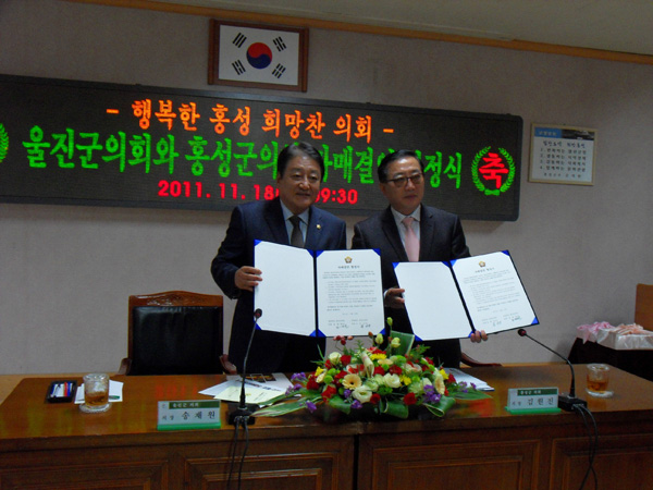 홍성군의회(의장 김원진)와 울진군의회(의장 송재원)가 자매결연을 맺고 상호협력을 약속했다.