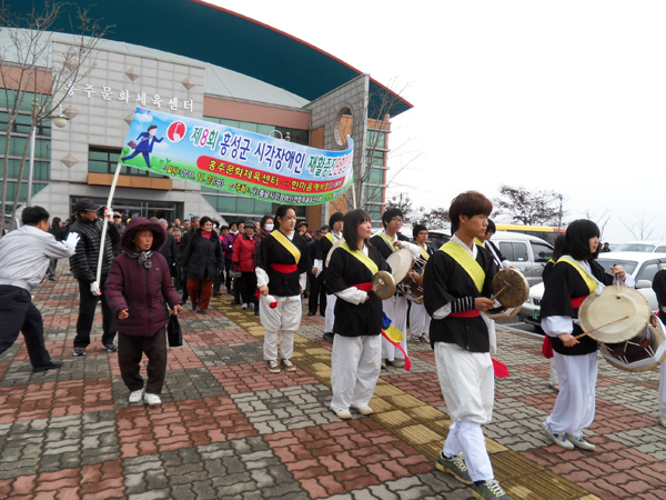 시각장애인들의 재활증진을 위한 제8회 홍성군시각장애인 단합걷기대회가 지난 23일 홍주문화체육센터에서 개최됐다. (사)충남시각장애인협회 홍성지회(회장 윤동돈)가 마련한 이번 대회는 시각장애인들에 대한 사회의 인식을 새롭게 하고 장애를 극복하려는 의지를 실천하기 위해 마련됐다. 이번 걷기대회는 1부 기념식으로 시작돼 시각장애인들은 한마음 한뜻으로 손을 마주잡고 홍주문화회관을 출발해 한마음예식장까지 2.3km를 함께 걸었다. 이어 중식 후 한마음 예식장에서 개최되는 2부 행사로 노래자랑 및 장기자랑이 펼쳐져 시각장애인들이 단합을 다지며 즐거운 한때를 보냈다.