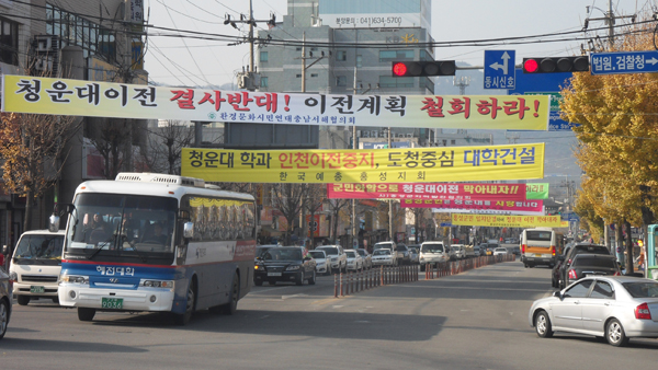 ‘청운대 이전 반대 주장’ 도로 가로지름 현수막 설치 묵인 비난