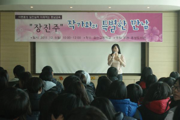 홍성도서관(관장 이용순)가 지난 5일 장진주 작가를 초청, ‘당신의 눈부신 꿈을 디자인하라’는 주제의 강연으로 갈산고등학교에서 ‘작가와의 특별한 만남’을 가졌다.