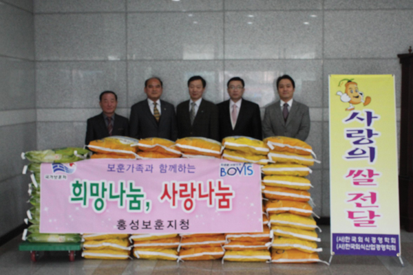 홍성보훈지청(지청장 박행병)은 (사)한국외식경영학회(조춘봉 회장 겸 청운대교수) 및 현대파워텍(주)과 연계해 국가를 위해 희생과 헌신하였지만 경제적으로 어려움을 겪고 있는 보훈가족들이 겨울을 따뜻하게 보낼 수 있도록 ‘사랑의 쌀’ (60포) 전달식을 가졌다.