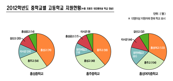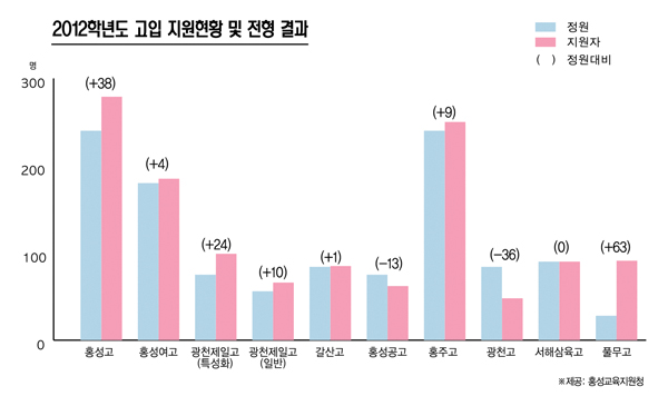2011년도의 경우 홍성고, 홍성여고, 광천제일고, 갈산고, 홍주고, 서해삼육고 등에 학생들이 초과 지원했음에 비해 2012년도 고입에서는 갈산고와 서해삼육고, 홍성여고 등은 지원자와 합격자가 거의 동률이고, 특히 홍성공고는 13명, 광천고는 36명이 미달돼 지원률 격차의 폭이 점차 커짐을 확인할 수 있었다.