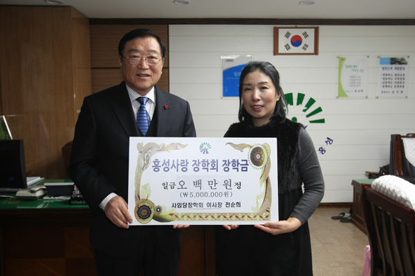 사임당장학회 전순희 회장은 지난달 27일 군청을 방문해 홍성사랑장학회에 장학금 500만원을 기탁했다.