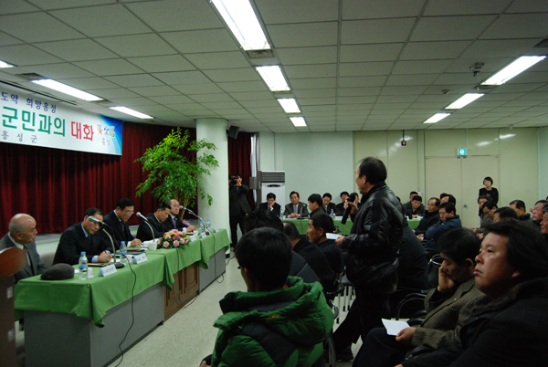군민과의 대화에서 홍성읍 이병욱 이장협의회장은 “홍성읍 청사가 너무 낡아 하루라도 빨리 이전해 신축해야 한다”고 말했으나 오관 1리 백승열 이장은 “홍성읍내 공동화 현상이 심각하므로 홍주성복원사업이 완전히 마무리 된 다음에 이전을 논의해야 할 것”이라고 주장했다.