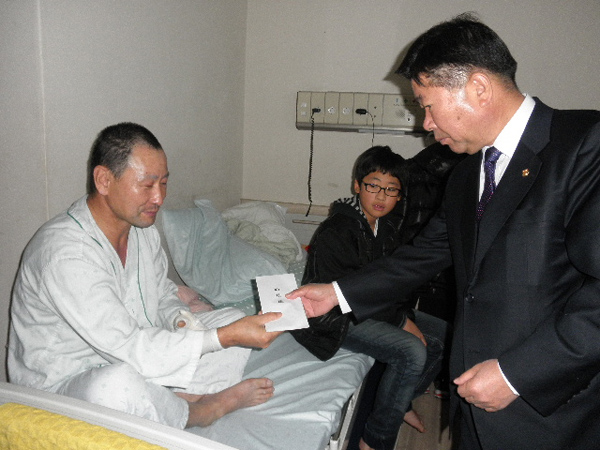 지난 15일 광천중학교 총동창회 최건환 회장(광천중학교 19회 졸업, 경주월드리조트 대표)가 지난 해 12월 17일 화재로 가옥과 가재도구를 모두 잃은 광천중학교 1학년 김윤태 학생 가족이 입원하고 있는 병원을 방문해 아버지 김종민 씨를 만나 쾌유를 기원하며 가족을 위로하고, 위로금 100만원을 전달했다.